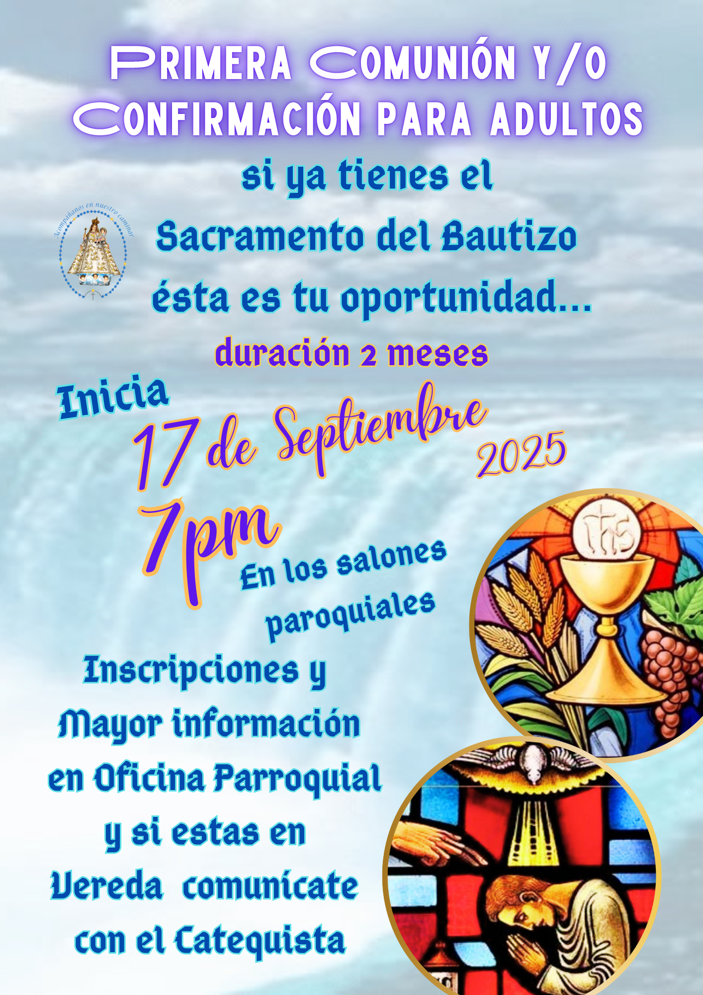 Tener presente en el año 2025 ya se está realizando las preparaciones y las Confirmaciones están agendadas para Noviembre de 2025 y las Primeras Comuniones en Diciembre 2025.