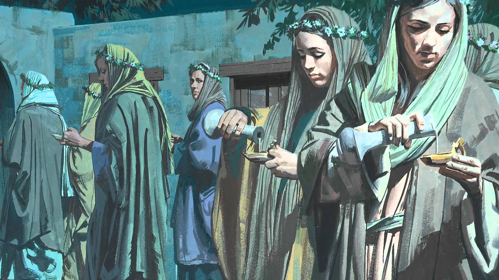 A continuación Jesús pronuncia varias parábolas que tienen como tema común, la vigilancia. Esta parábola de las diez jóvenes del cortejo es una de ellas.