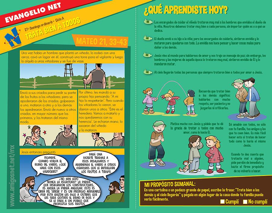 Mateo 21, 33- 43 para niños. 3 de Octubre de 2014 Jesús nos enseña hoy que no es correcto comportarnos mal y no ser agradecidos con quienes nos han dado la mano. Dios se da cuenta cuando obramos mal con nuestros… Like 0 Dislike 0 Otros artículosNovena de Aguinaldos y su origen. Horario13 de Diciembre de 2025Las novenas, o novenario es una costumbre muy antigua que tiene sus raíces en la época colonial. Nota doctrinal sobre los títulos marianos: La Madre del Pueblo Fiel, no Corredentora4 de Noviembre de 2025El documento del Dicasterio para la Doctrina de la Fe aprobado por León XIV aclara los apelativos que deben usarse para...