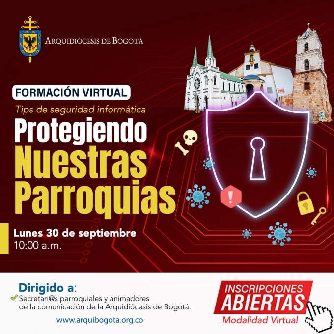 El departamento de sistemas, en colaboración con la oficina de comunicaciones de la Arquidiócesis de Bogotá, anuncian una segunda fecha de formación virtual titulada "Tips de seguridad informática - Protegiendo Nuestras Parroquias". Este evento está programado para el lunes 30 de septiembre a las 10:00 A.M. y está abierto para inscripciones para todas las secretari@s parroquiales y animadores de la comunicación de la Arquidiócesis de Bogotá que no pudieron asistir a la formación del pasado lunes 26 de agosto.