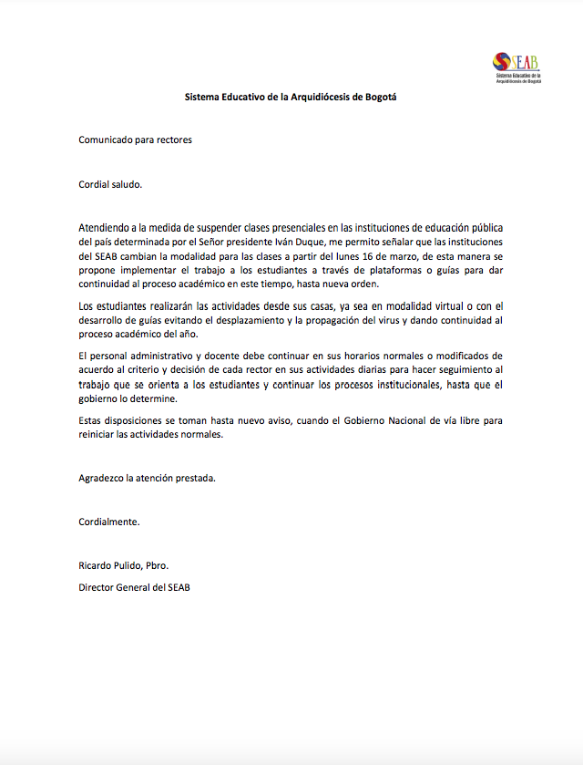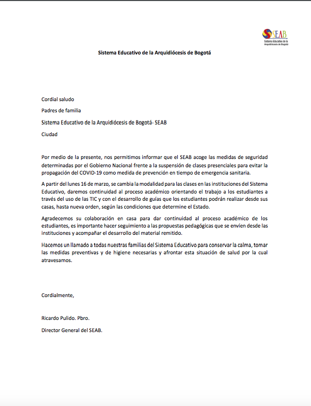 Centro de información Yo quiero Noticias Boletines Eventos Artículos Canonización Mensajes del Señor Cardenal Cartas pastorales Homilías Mensajes La voz del pastor Documentos del Vaticano NoticiasLa dirección general del SEAB informa16 de Marzo de 2020En relación con la Emergencia Sanitaria decretada por el Gobierno Nacional ante situación de salud Pública por COVID-19 el Sistema Educativo de la arquidiócesis de…Comunicado para rectores de colegios Comunicado para padres de familia Like 0 Dislike 0 Noticias relacionadas Archivo del Plan de Predicación - 2024-2025 Tiempo para nutrir, cuidar y testimoniar la fe La Arquidiócesis de Bogotá celebró la ordenación de nuevos sacerdotes y diáconos