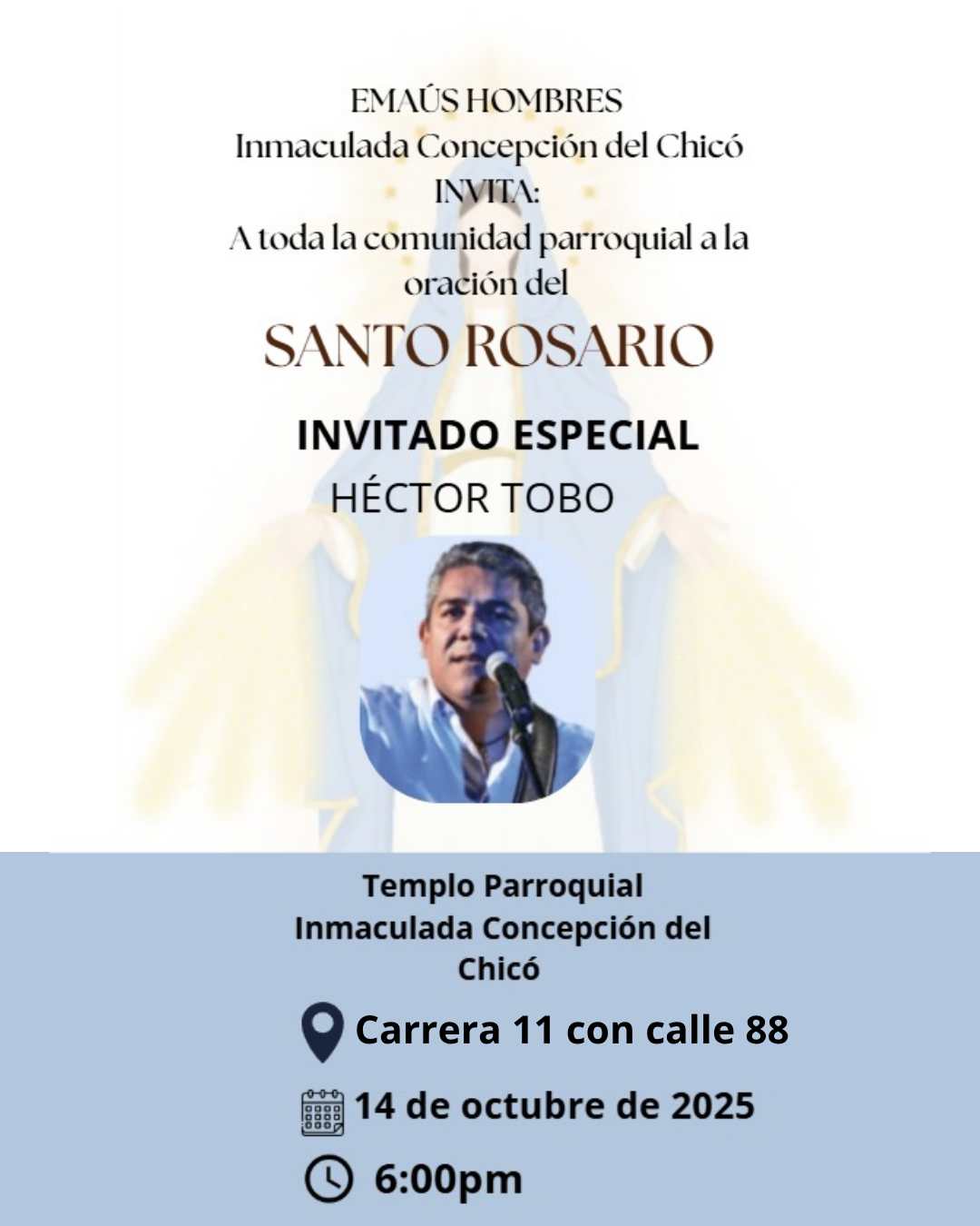 Invitamos a la comunidad parroquial a participar en el Santo Rosario el martes 14 de octubre a las 6:00 pm, contaremos con la presencia del cantautor católico Héctor Tobo, invitado especial, del grupo Emaús hombres de nuestra parroquia.